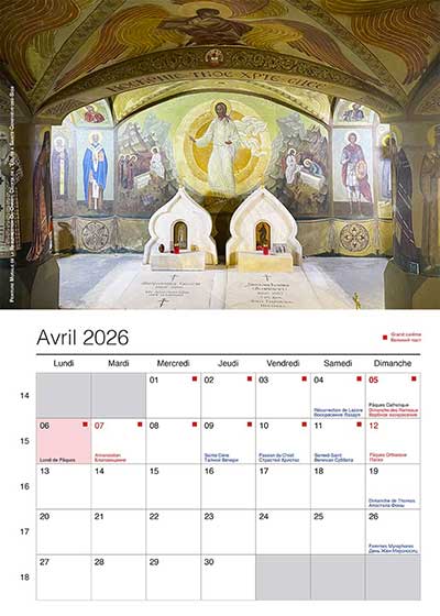 Les magnifiques peintures murales de la crypte et de l'église sont l'œuvre de l'architecte et peintre-décorateur Albert Benois et de son épouse Marguerite. Dans la moitié inférieure du calendrier figurent les jours du mois dans des cases avec un espace suffisant pour pouvoir inscrire ses propres rendez-vous. Les fêtes françaises sont inscrites en noir dans les cases. Les fêtes Orthodoxes, écrites en français et en russe, apparaissent également en bleu ou en rouge pour les fêtes principales et les jours des carême Orthodoxes sont également indiqués.